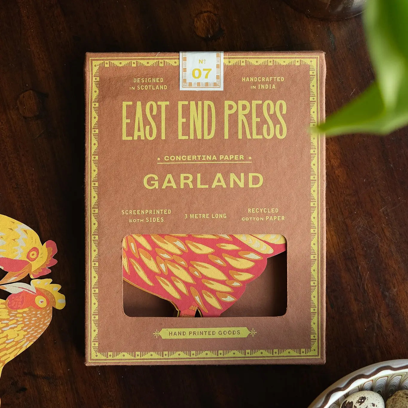 A colourful chicken with patterned feathers and wings repeats along the length of this folded garland, perfect for springtime decorating or adding some fun to your kitchen. The garland is three metres in length and made from 100% recycled content paper