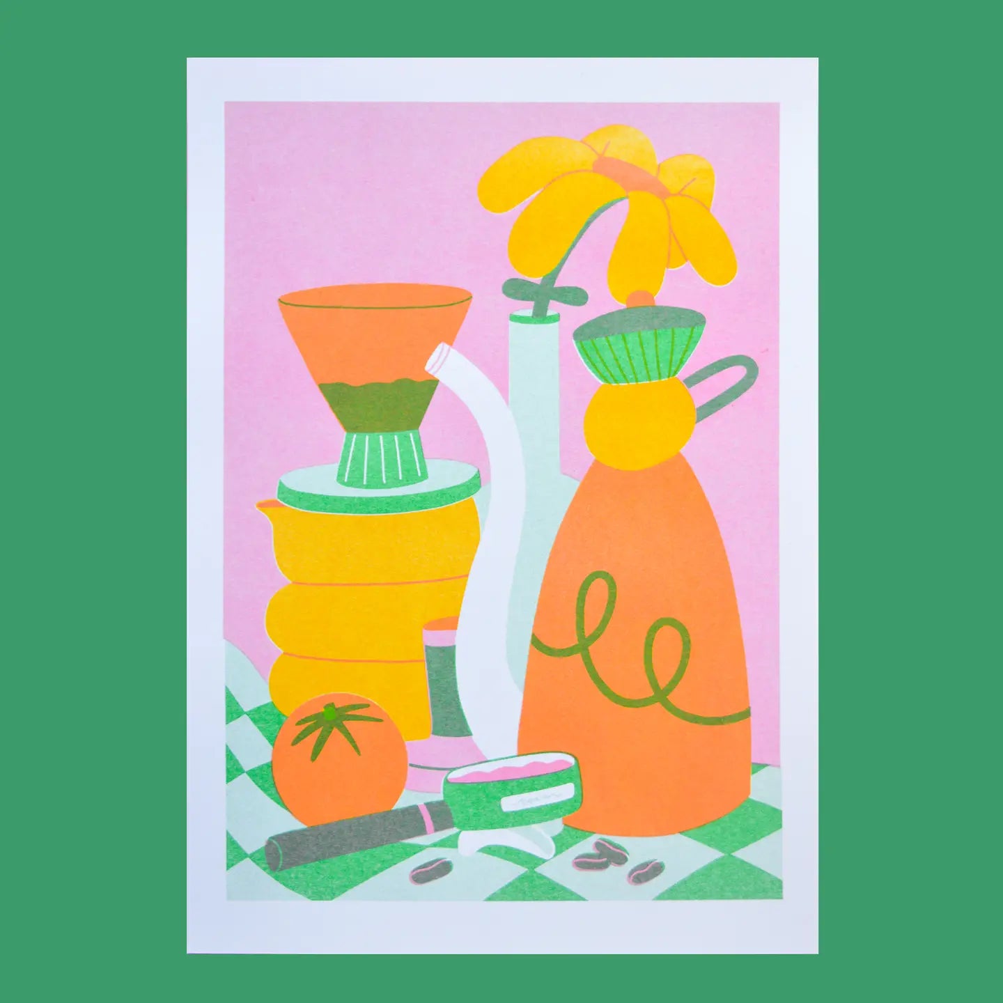 'Coffee' A4 Risograph Print, 3 Colours. 160gsm Echo paper, made from 100% recycled post-consumer waste. Riso is an eco-friendly print process with a unique aesthetic. Prints are signed and packaged with a card backing and biodegradable cello sleeve.