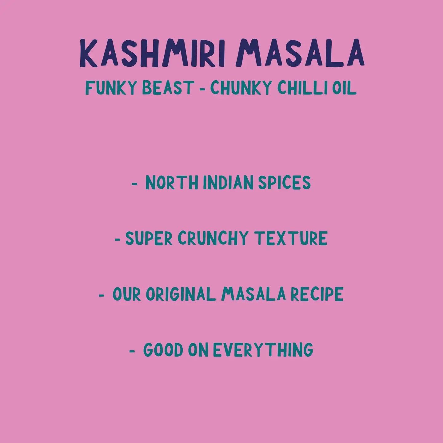 Kashmiri Masala is a blend of the delicious Kashmiri and Keating & Co. Condiments unique Masala, Inspired by the flavours from North India The Funkiest & Chunkiest Chilli Oil on the market has proven to be the crowd favourite and has found great use stirred through a Cucumber salad, drizzled over any Curry or Rice dish, Chilli Scrambled Eggs, with Hummus for an amazing dip and even on a toasted Peanut Butter Sandwich!