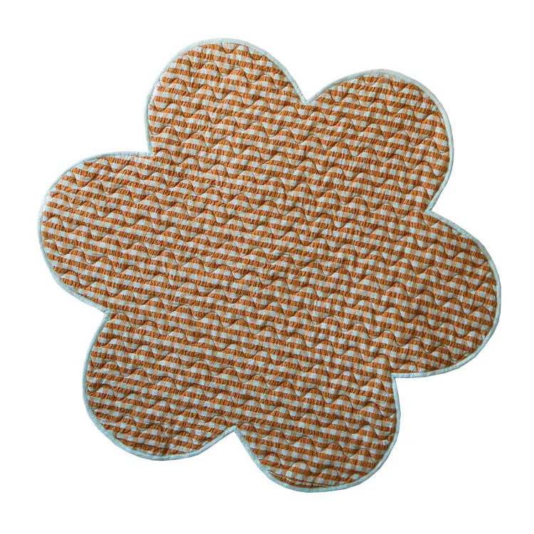 Soft, sweet, and full of charm, the Honey Blue Seersucker Playmat is made for playful moments and cosy floor time. Designed in our signature flower petal shape, this mat brings a whimsical touch to any nursery, living room, or play space. Made from 100% cotton, it features a textured chocolate and light blue seersucker check on one side and a solid chocolate cotton on the reverse - giving you two looks in one. The wavy quilting pattern adds extra personality, while the 320gsm cotton wadding fill ensures it's plush, soft, and comfortable for little ones to stretch, roll, or snooze on. Whether you're creating a cosy corner or packing it for playtime on the go, this mat is as functional as it is adorable. We recommend a cold, gentle machine wash before using. 𝐃𝐞𝐭𝐚𝐢𝐥𝐬 • 100% cotton outer and fill • 1.2m in diameter • Machine washable • Original Mosey Me design • Responsibly made in India