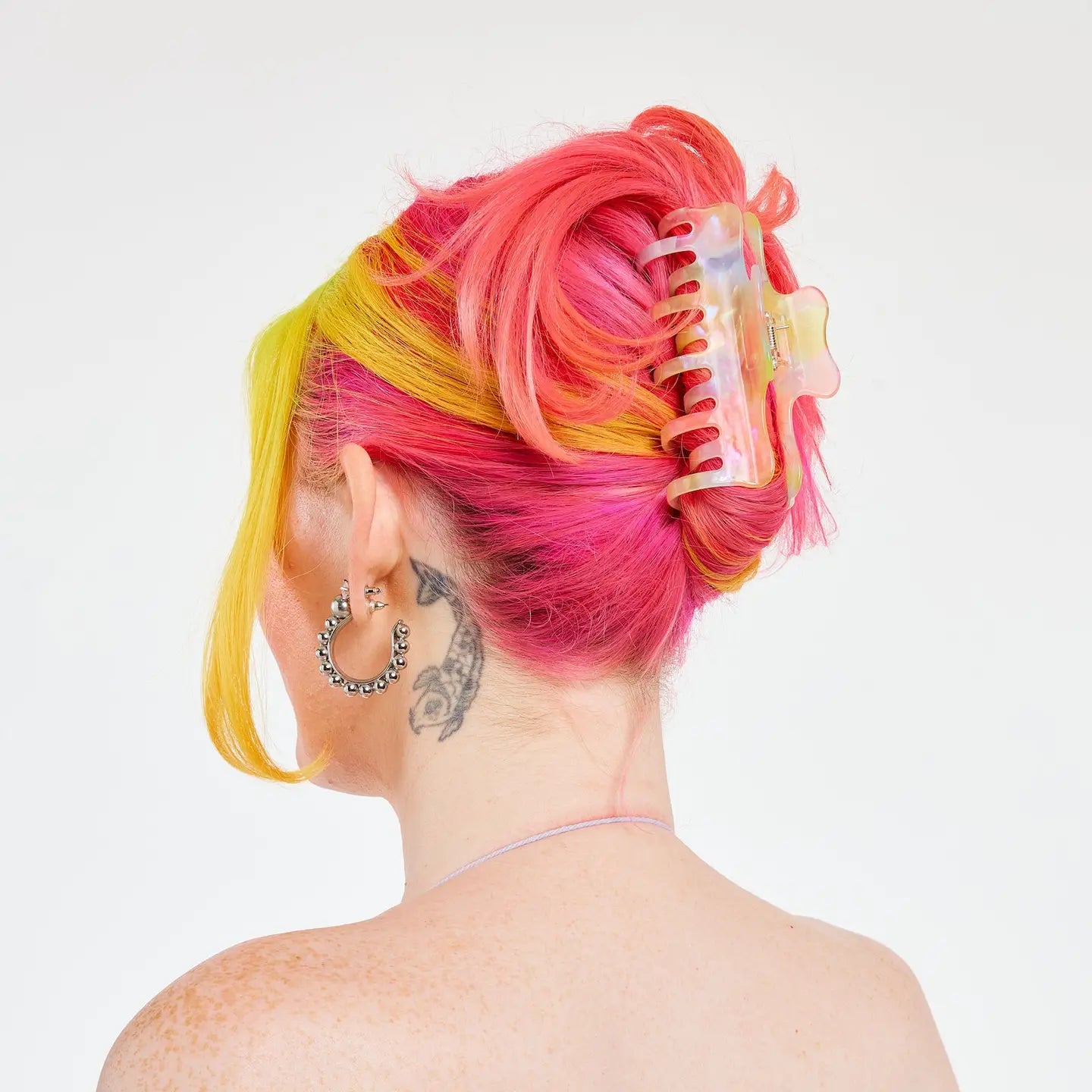 This claw has a double row of teeth for an extra secure hold. Works with all hair types and great for fine or slippery hair. Made from high quality acetate; a durable, plant based bio-plastic. Metal hardware is lead and nickel-free. Slight variations will appear with pattern, color and form due to the handmade nature of the product. Measures approx 4.3"L x 1.96"W x 1.96"D Color: multicolor, yellow, blue, pink