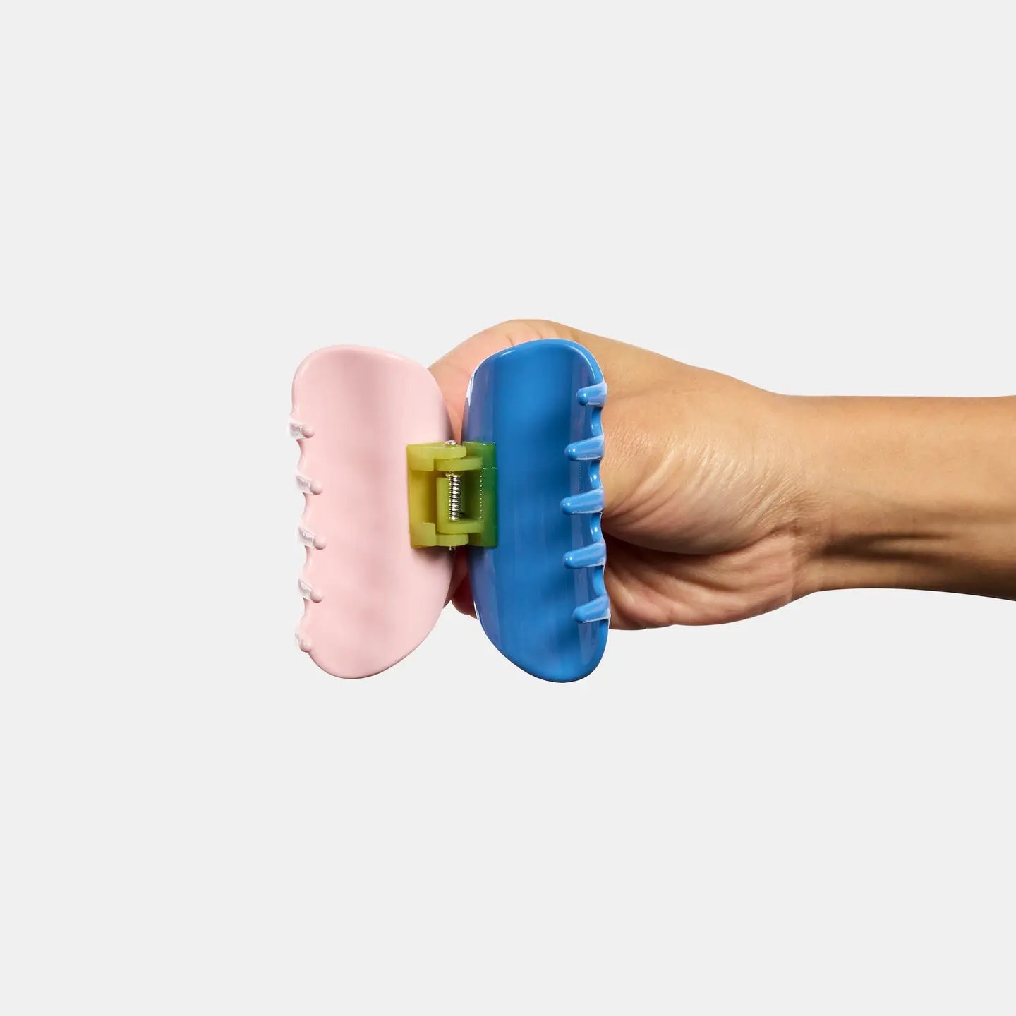 This small-ish-sized hair claw is recommended for all hair types and textures. Perfect for fine hair buns and thicker hair half-updo's! Made from high quality acetate; a durable, plant based bio-plastic. Metal hardware is lead and nickel-free. Slight variations will appear with pattern, color and form due to the handmade nature of the product. Measures approx 2.75"L x 1.5"H x 1.5"D Color: blue, pink, silver tone hardware