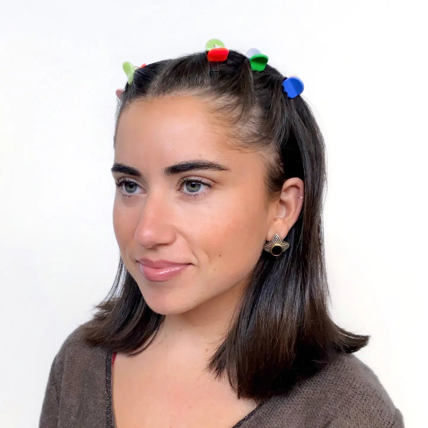 Six micro (but mighty!) claws, perfect for styling all hair types and textures. Made from high-quality acetate; a durable, plant-based bio-plastic. Metal hardware is lead and nickel-free. Slight variations will appear with pattern, color, and form due to the handmade nature of the product. Measures approx 0.75""L x 0.75""H x 0.75""D Color: neon red, light yellow, blue, pink, green, light blue, silver-tone hardware