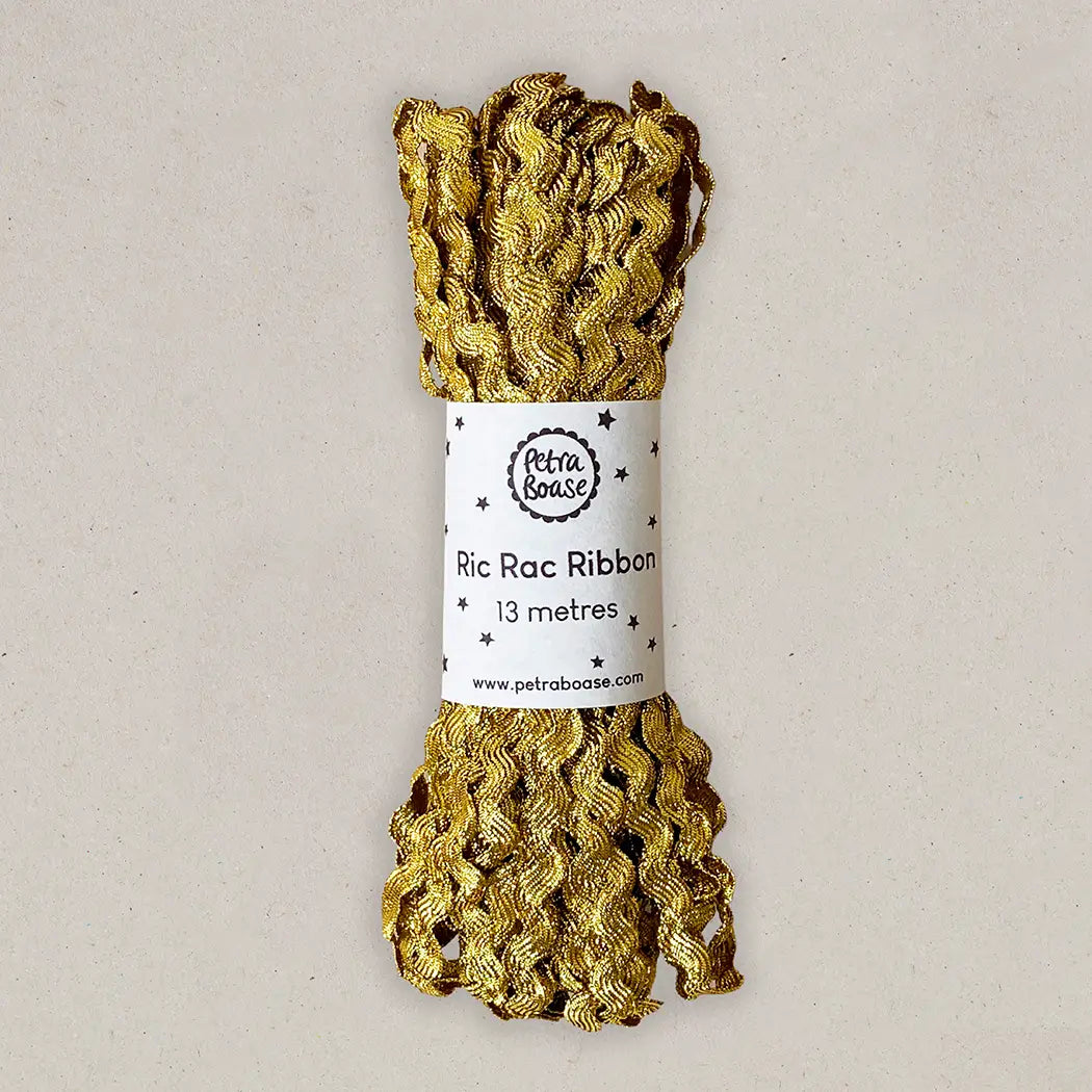 Jewel coloured metallic ric rac ribbon for all year round gift wrapping and crafting. Ribbon width - 8mm Ribbon length - 15yds/13 metres Woven polyester and metallic thread.