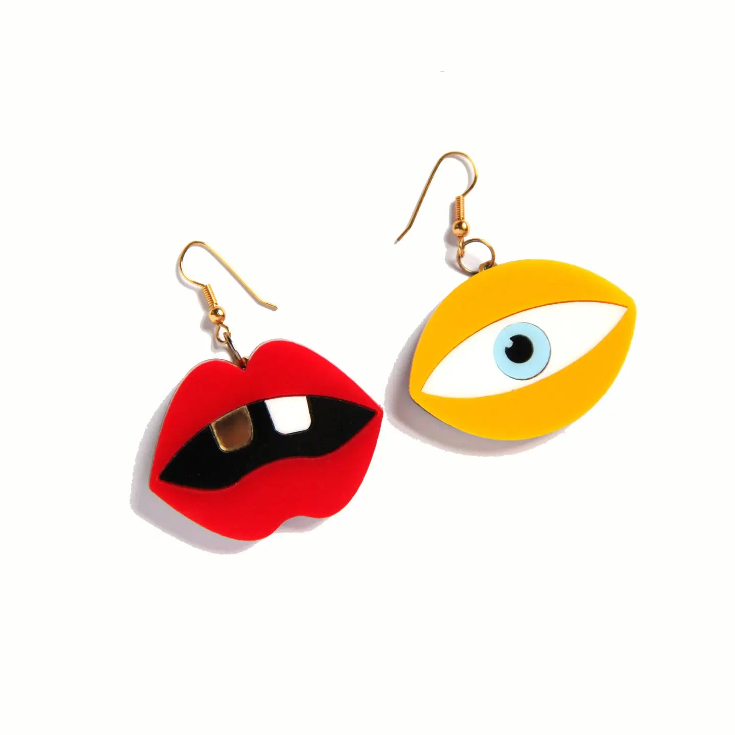 Acrylic Face Earrings. Materials: * Laser cut acrylic with wooden back. Backings: * Stainless steel hypoallergenic hooks.
