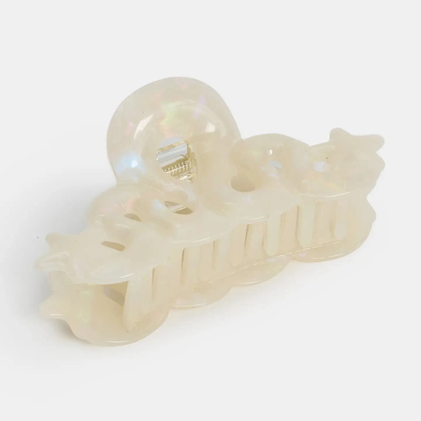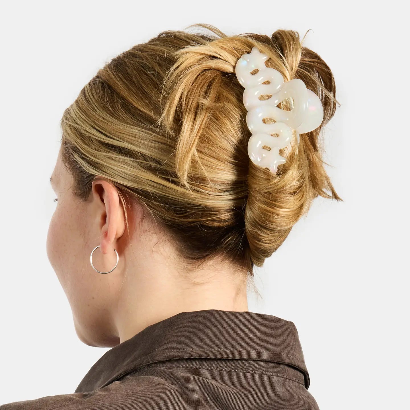 This large hair claw works like a dream on all hair types and textures. Perfect for medium to longer hair lengths. Made from high quality acetate; a durable, plant based bio-plastic. Metal hardware is lead and nickel-free. Slight variations will appear with pattern, color and form due to the handmade nature of the product. Measures approx 5"L x 2.25"H x 1.75"D Color: clear, red, blue, green, black, silver tone hardware